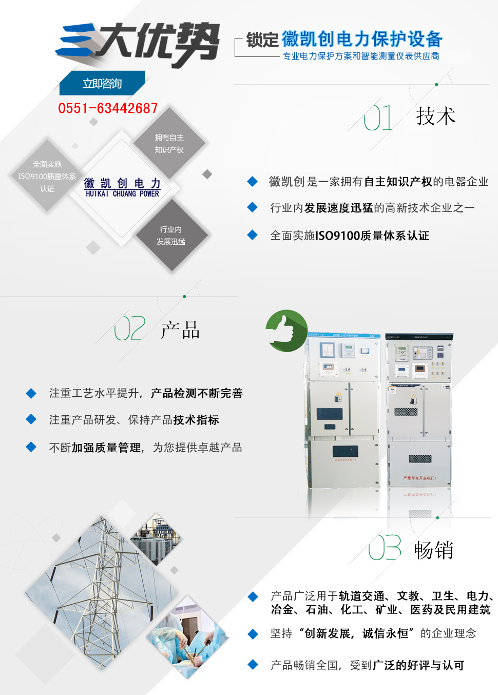 安徽徽凱創(chuàng)電力保護設(shè)備有限公司主要從事新型電氣設(shè)備、電子設(shè)備、智能控制技術(shù)的產(chǎn)品研發(fā)、生產(chǎn)、銷售。主要產(chǎn)品有:智能型消弧消諧裝置、消諧過電壓抑制柜、 組合式過電壓保護、智能型開關(guān)柜智能操控裝置、微機消諧、小電流選線、電弧光保護裝置、智能在線絕緣監(jiān)測裝置等電氣產(chǎn)品。 產(chǎn)品廣泛用于石化、煤炭、電力、建筑、市政、機場、鐵路、醫(yī)院、學校等領(lǐng)域,受到用戶一致好評。